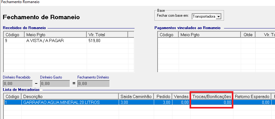 OBS:A lista de mercadorias mostra a quantidade de itens para troca/bonificação que estão no romaneio e de pedidos importados para operação diversa naquele dia, mesmo que a operação diversa não esteja no romaneio.