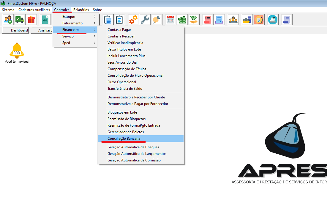 Para abrir a nova janela, siga o caminho: Controles > Financeiro > Conciliação Bancária.