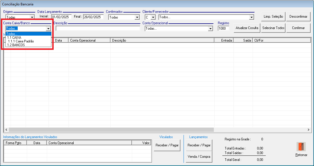 • Todas: Exibe lançamentos de todas as contas Caixa e Banco.