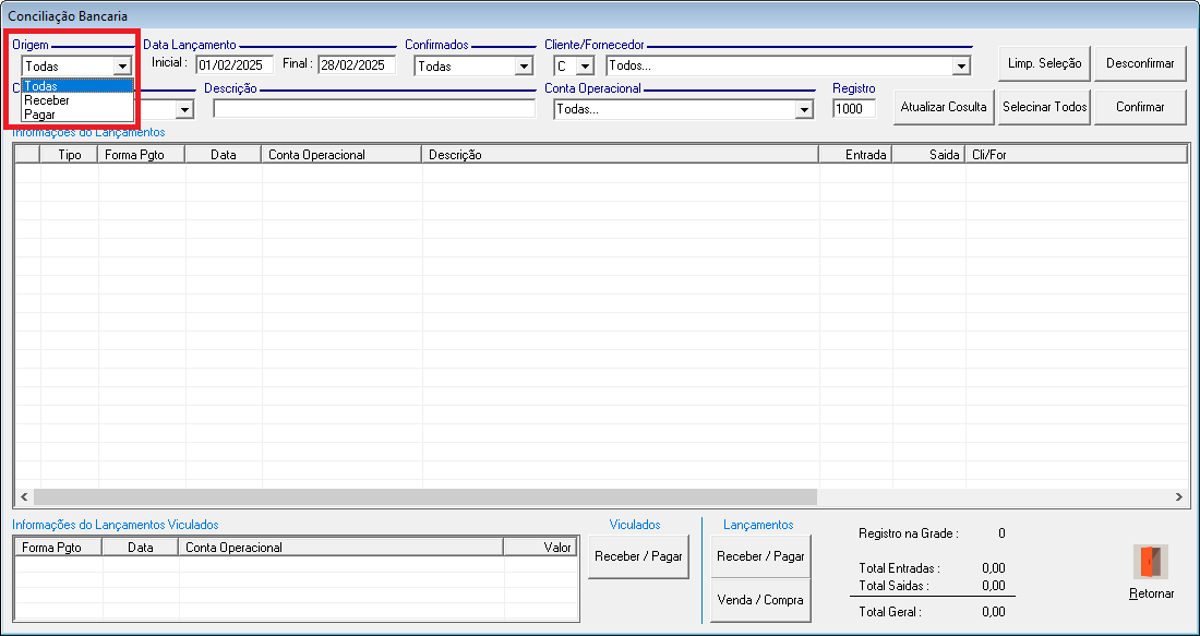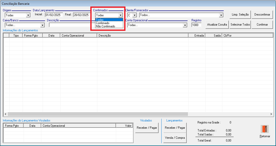• Todas: Exibe lançamentos Confirmados e Não Confirmados.