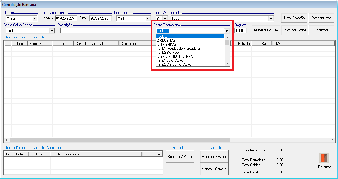 • Todas: Exibe lançamentos de todas as contas operacionais.
