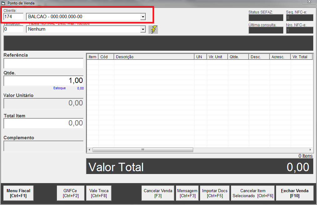 Localizado o campo, insira o cliente por meio do código ou da razão social cadastrada no sistema. Em seguida insira as mercadorias e finalize a venda. Pronto, sua NFC-e será emitida com os dados do cliente.