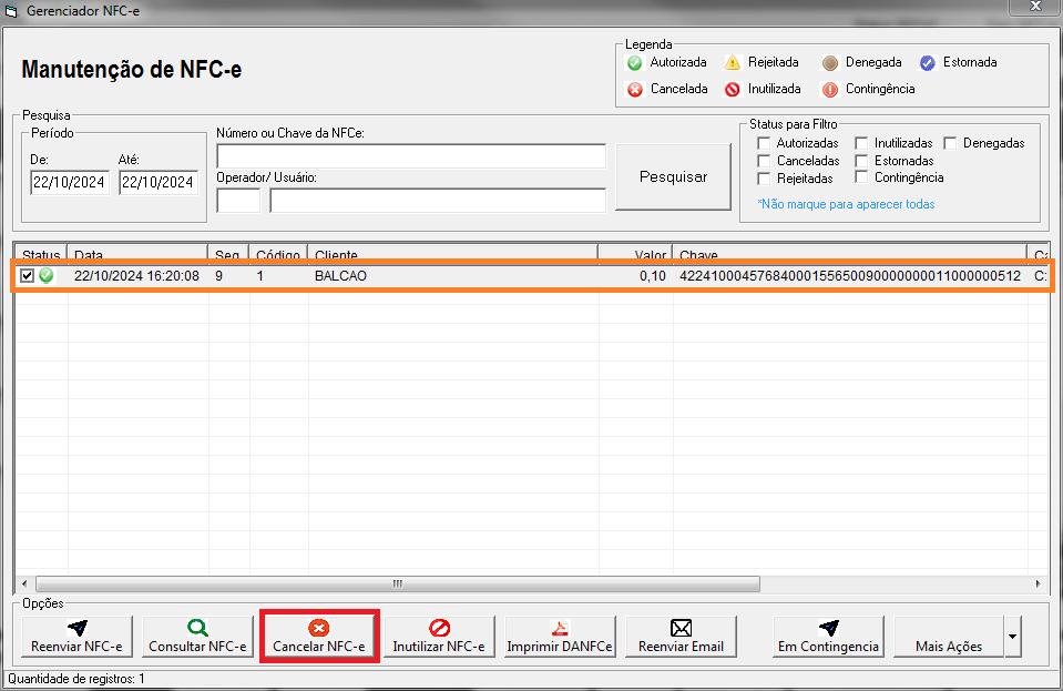 Aberto o Gerenciador de NFCe, selecione a nota que deseja cancelar e clique no botão “Cancelar NFC-e” indicado na Imagem 3.
