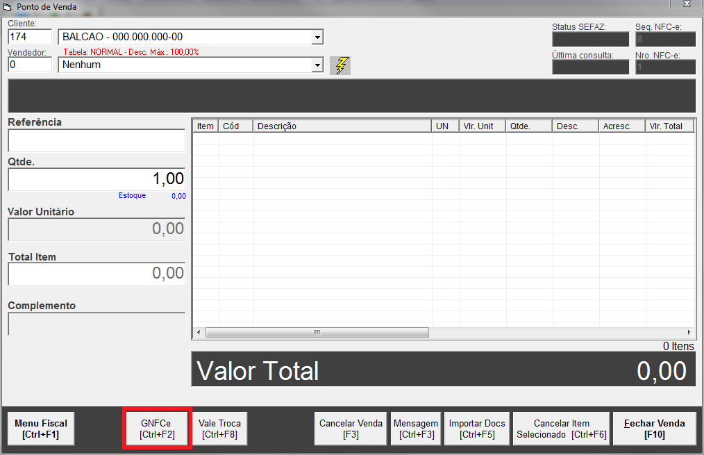Acessando a tela de venda no Frente de Caixa, clique no botão “GNFCe” indicado na Imagem 2.